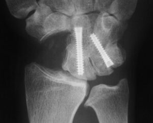 Radiografie van pols na scafoidectomie en 4 corner fusie