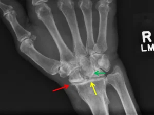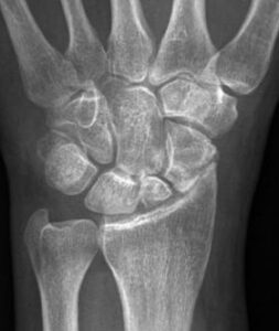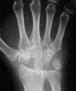 Radiografie van polsarthrose ten gevolge van niet geheelde breuk (links) of (onbehandeld) ligamentair letsel (rechts)