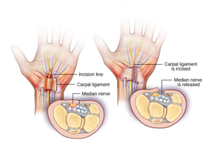 van 2-3cm in de pols. In de diepte wordt dan de het ligament die over de zenuw en pezen gespannen staat doorgenomen. (Het dak van de tunnel wordt geopend)