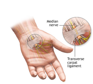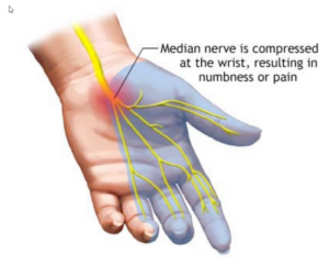 De zenuw die duim, ring en middelvinger van gevoel voorziet is bekneld in de pols.