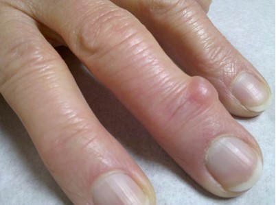 Bij artrose van de vingergewrichten kan een uitstulping van het gewrichtskapsel ontstaan, een mucoïd cyste. Dit is gevuld met gel.